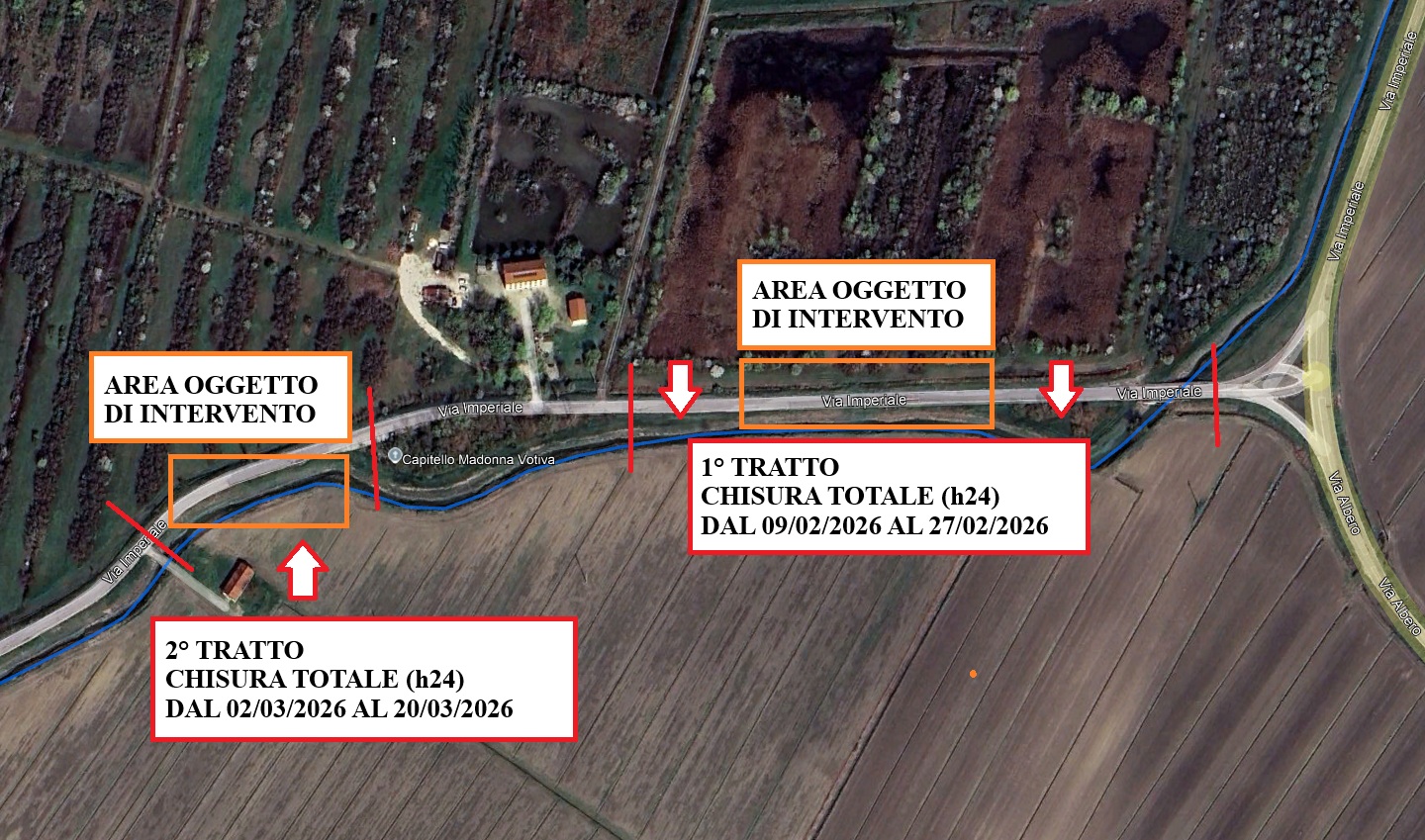 1° FASE - CHIUSURA TOTALE H24 DAL KM 7+620 AL KM 7+985 (intersezione con la SP 9.1 “diram. dell’Albero”) nel periodo compreso dal 09/02/2026 al 27/02/2026;