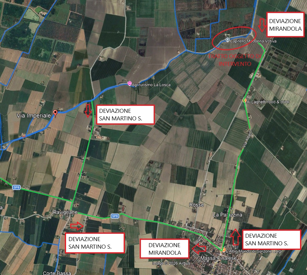 Per lavori di ripresa frane della Fossa Reggiana, a cura del Consorzio della Bonifica Burana si rende necessario procedere alla chiusura al transito veicolare e pedonale di un tratto della SP 9 “Imperiale” tra il Km 7+360 ed il Km 7+985 (intersezione con la SP 9.1 “diram. dell’Albero”), con le seguenti fasi: