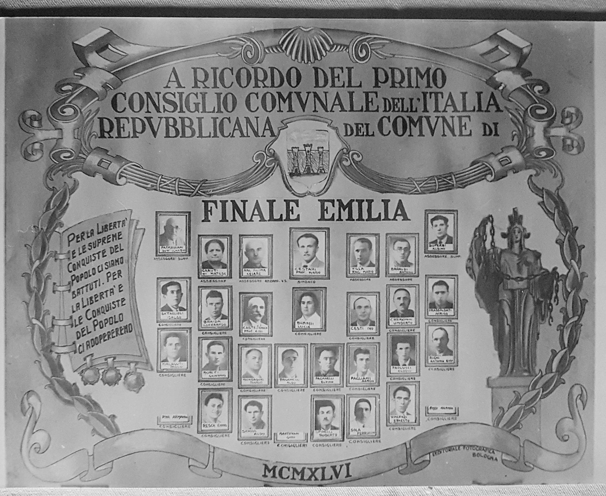 Il 26 marzo 1946 alle ore 16 il consiglio comunale si insediò con i consiglieri Ennio Resca, Mario Cestari, Aldo Paganelli, Albino Superbi, Ferruccio Sola, Mario Mondadori, Ivo Cesti, Mario Villa, Giovanni Moretti, Iolando Rossi, Arrigo Frassoldati, Roberto Spinelli, Antonio Baraldi, Matilde Garutti, Umberto Cremonini, Sergio Pagliani, Aldo Savoia, Ildebrando Braida, Idalgo Battaglioli, Ernesto Vincenzi, Elvino Paganelli, Clodio Paolucci, Lucia Begnozzi, Paolo Malaguti, Ciro Castelfranchi, Ignazio Parmeggiani, Cesare Farina, Armando Piva, Gino Roberto Mantovani, Antonio Eolo Righi.