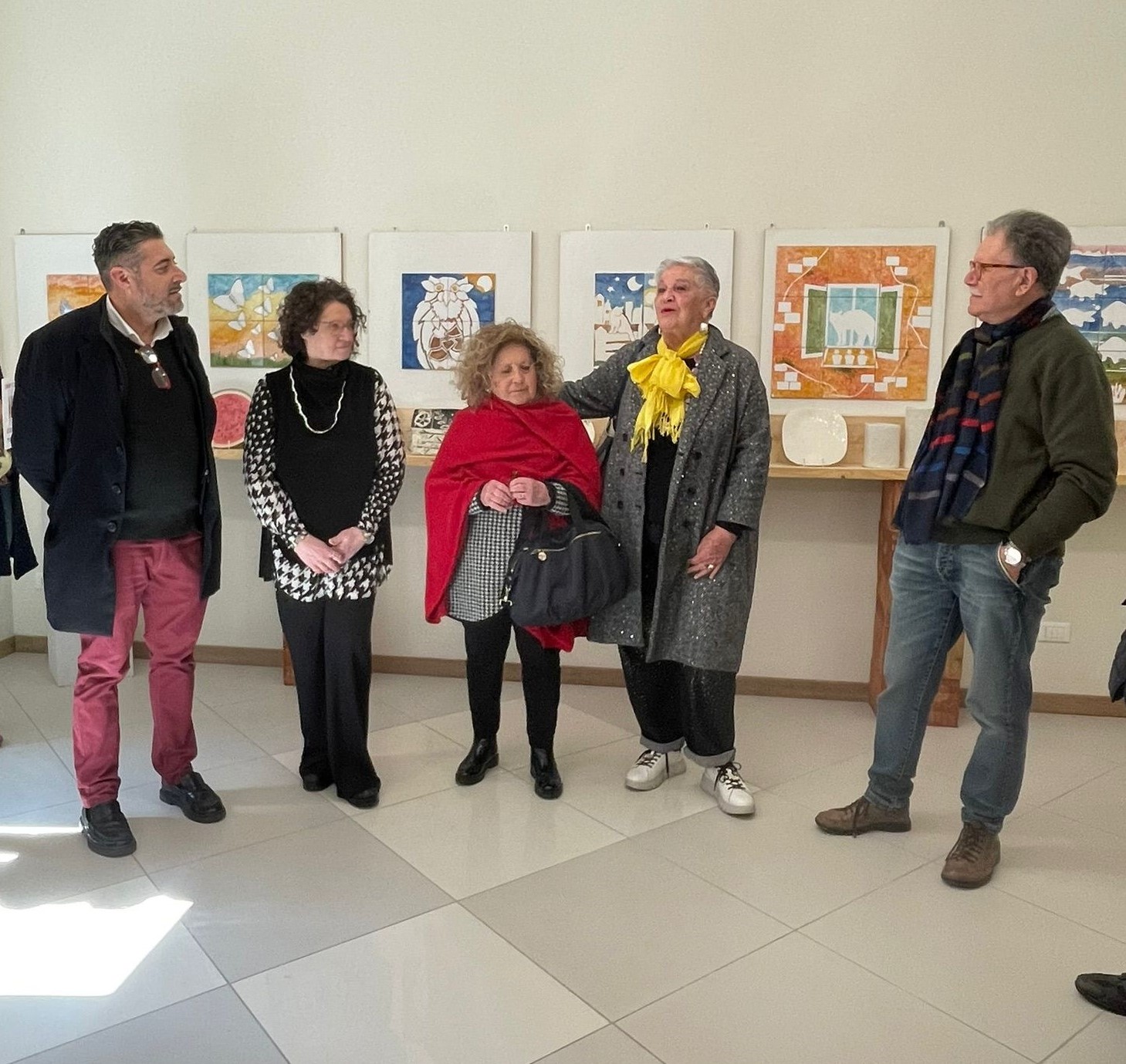 Nell'immagine sopra: il vice sindaco Michele Gulinelli, la vice presidente di Alma Finalis e volontaria di Manifatti, Denise Toselli, le insegnanti Anna Dina Battaglioli e Carla Masi e l'architetto Gherardo Braida, tra i curatori della mostra.