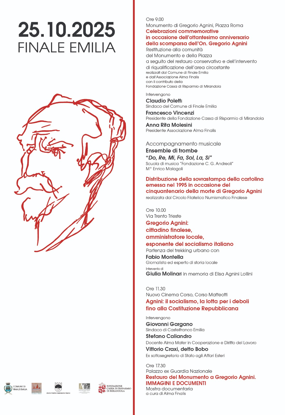 In occasione dell’ottantesimo anniversario della morte, il Comune di Finale Emilia ricorda Gregorio Agnini con una serie di iniziative realizzate con la collaborazione di Alma Finalis, Fondazione Cassa di Risparmio di Mirandola, Circolo Filatelico Numismatico Finalese e Psi - Federazione di Modena.