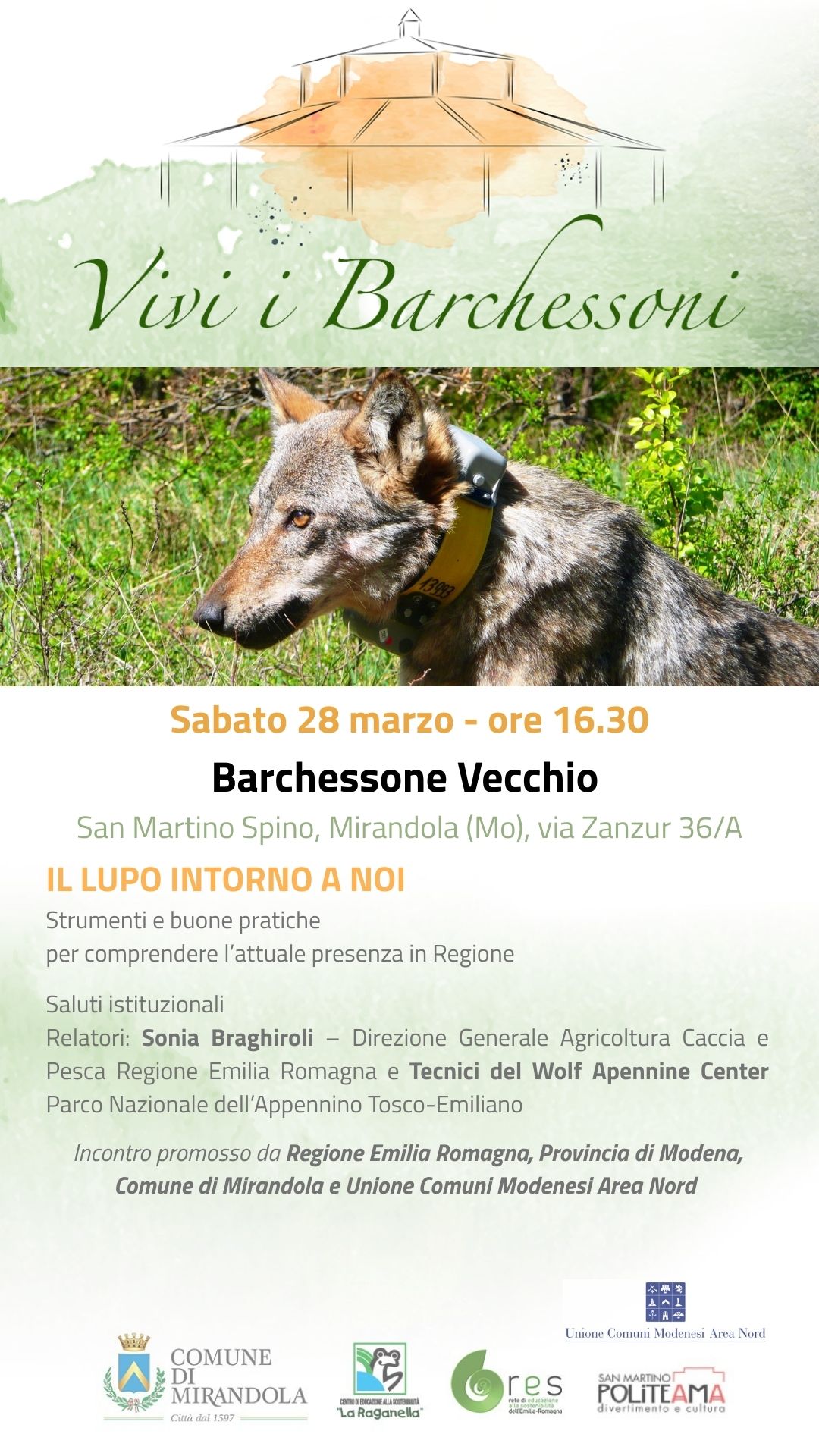 Il secondo incontro si terrà sabato 28 marzo alle ore 16.30 presso il Barchessone Vecchio di San Martino Spino (Mirandola), con il titolo “Il lupo intorno a noi”, e sarà specificamente dedicato alla presenza del lupo in Emilia-Romagna, con interventi istituzionali e tecnici per approfondire strumenti e buone pratiche di convivenza, promosso dal Comune di Mirandola, Regione Emilia Romagna, Provincia di Modena e UCMAN.