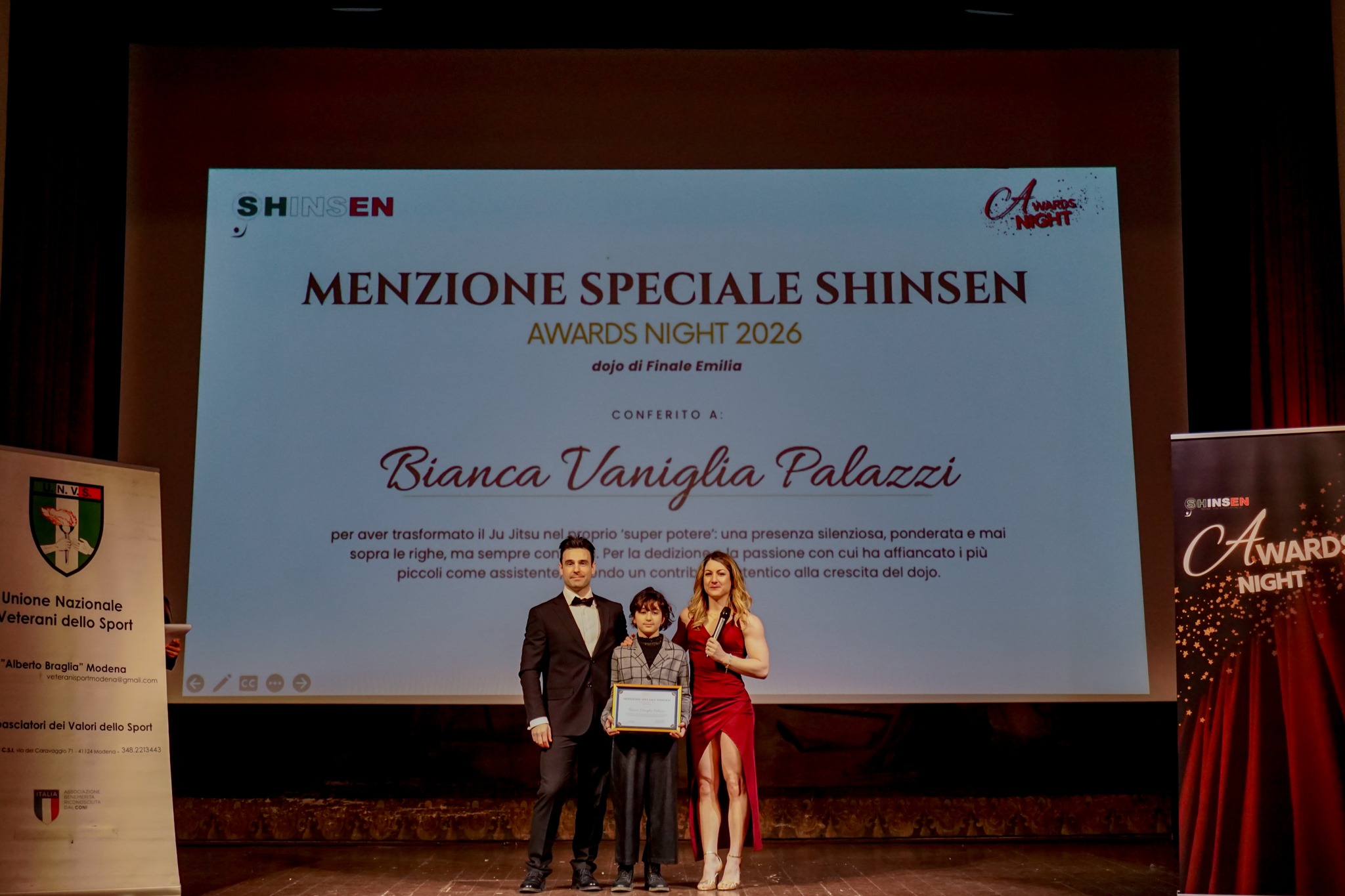 Nel corso della serata sono stati premiati anche atleti del territorio di Finale Emilia: Bianca Vaniglia Palazzi, atleta del dojo Shinsen Academy di Finale Emilia, ha ricevuto la Menzione Speciale 2026, mentre Il dojo di Finale Emilia ha ricevuto il Certificato di Eccellenza 2026, ritirato sul palco da Sara Paganini.
