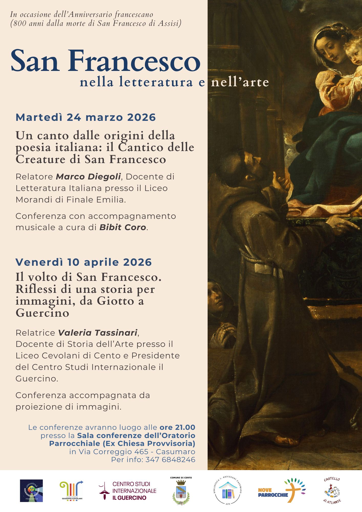 In occasione dell’ottocentesimo anniversario della morte di San Francesco d’Assisi, la Biblioteca Ileana Ardizzoni di Casumaro promuove il mini ciclo di conferenze “San Francesco nella letteratura e nell’arte”, realizzato in collaborazione con l’associazione “9 Parrocchie”, l’associazione “Il Castello di Atlante”, il Centro Studi Internazionale Il Guercino, il Liceo Ginnasio Statale G. Cevolani di Cento e il Liceo Scientifico Statale M. Morandi di Finale Emilia.