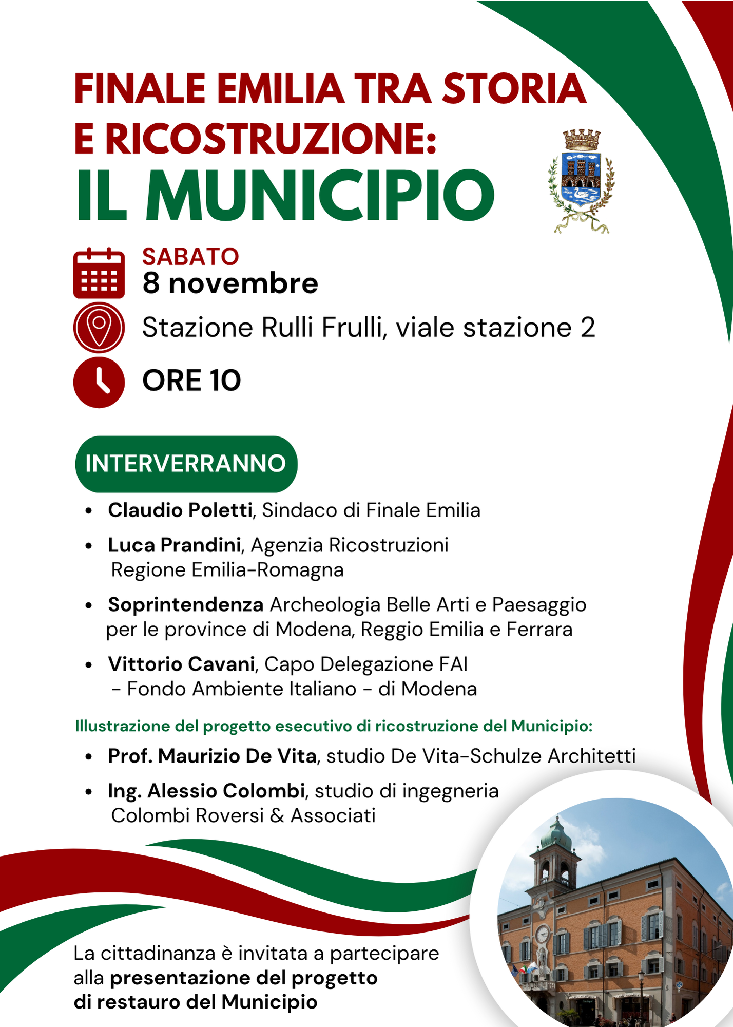 Oggetto dell'evento sarà il Municipio, gravemente danneggiato dal sisma 2012 e attualmente inutilizzabile. Dopo gli interventi di saluto e introduzione del sindaco Claudio Poletti, di Luca Prandini dell'Agenzia Ricostruzioni della Regione Emilia Romagna, di un funzionario della Soprintendenza Archeologia belle arti e paesaggio per le province di Modena, Reggio Emilia e Ferrara e di Vittorio Cavani, capo delegazione FAI di Modena, toccherà ai progettisti del complesso intervento di riqualificazione del Municipio illustrare le soluzioni architettoniche e strutturali individuate per far rinascere la casa di tutti i finalesi, l'edificio che più è mancato a tutti i cittadini tra i tanti danneggiati dal terremoto.