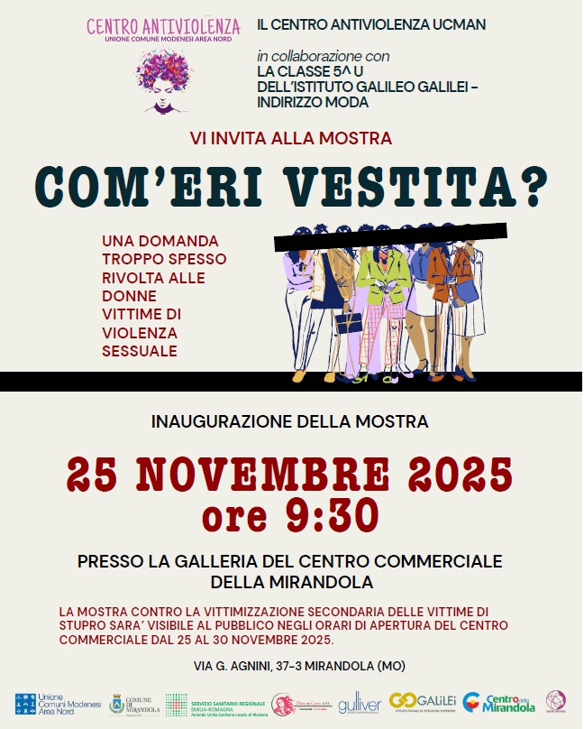 In occasione della Giornata internazionale per l’eliminazione della violenza contro le donne, il 25 novembre 2025 alle ore 9:30 presso la Galleria del Centro Commerciale La Mirandola sarà inaugurata la mostra “Com’eri vestita?” un percorso espositivo contro la vittimizzazione secondaria delle donne che subiscono violenza sessuale.