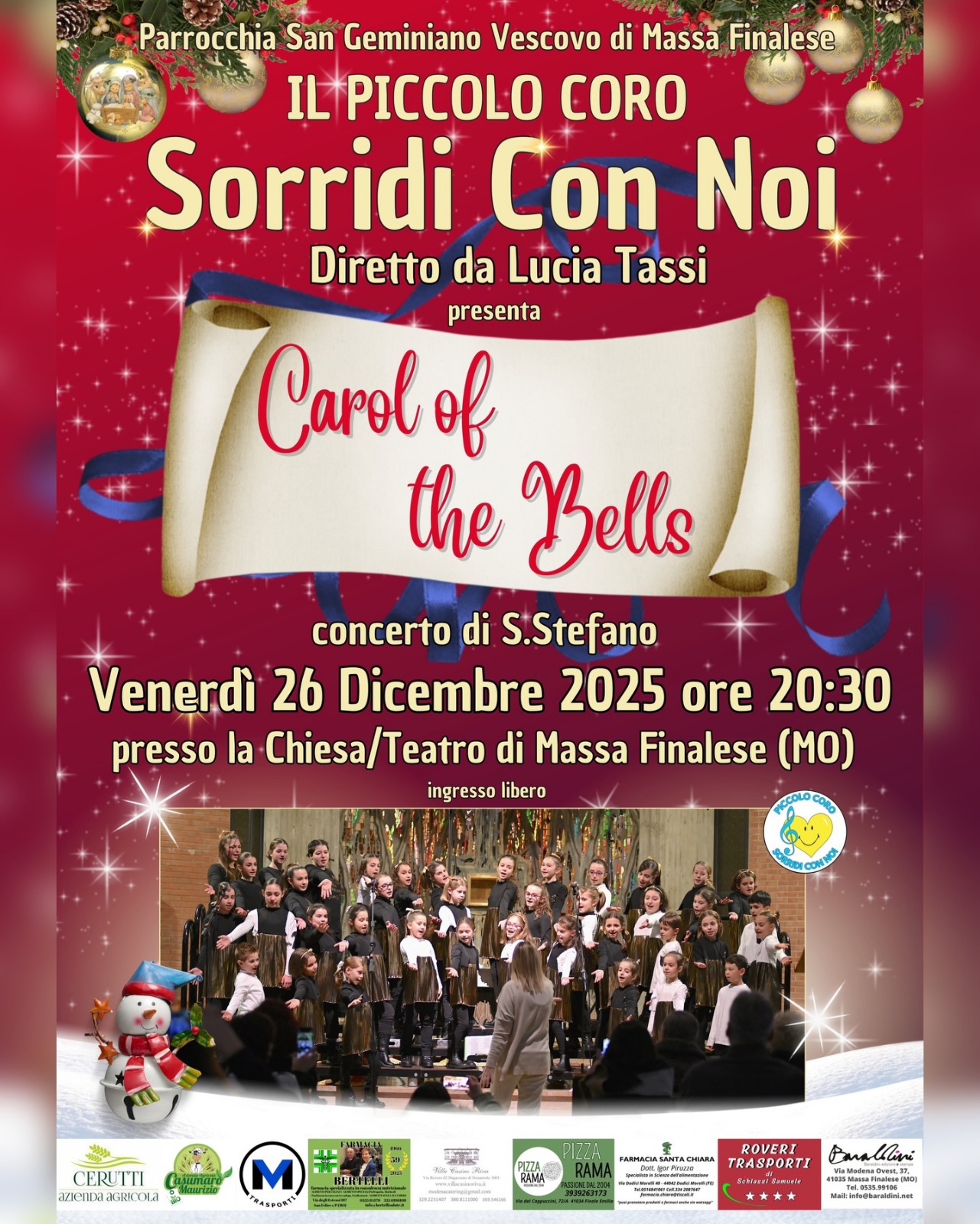 Venerdì 26 dicembre, alle ore 20.30, alla Chiesa/Teatro Verdi di Massa Finalese, Il Piccolo Coro Sorridi con Noi, diretto dalla maestra Lucia Tassi, presenta il tradizionale Concerto di Santo Stefano.