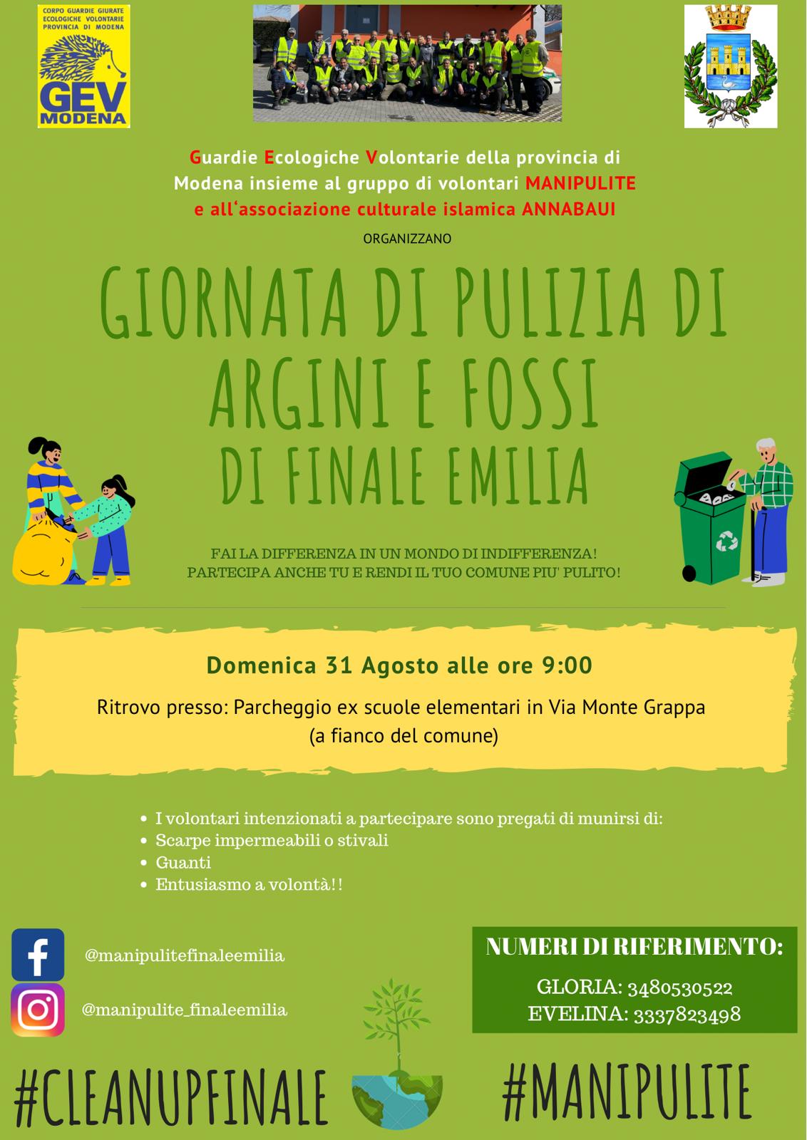 Domenica 31 agosto a partire dalle ore 9.00, giornata di pulizia di argini e fossi di Finale Emilia, a cura delle Guardie Ecologiche Volontarie della provincia di Modena, insieme al gruppo di volontari Manipulite e all'associazione culturale islamica Annabaoui.