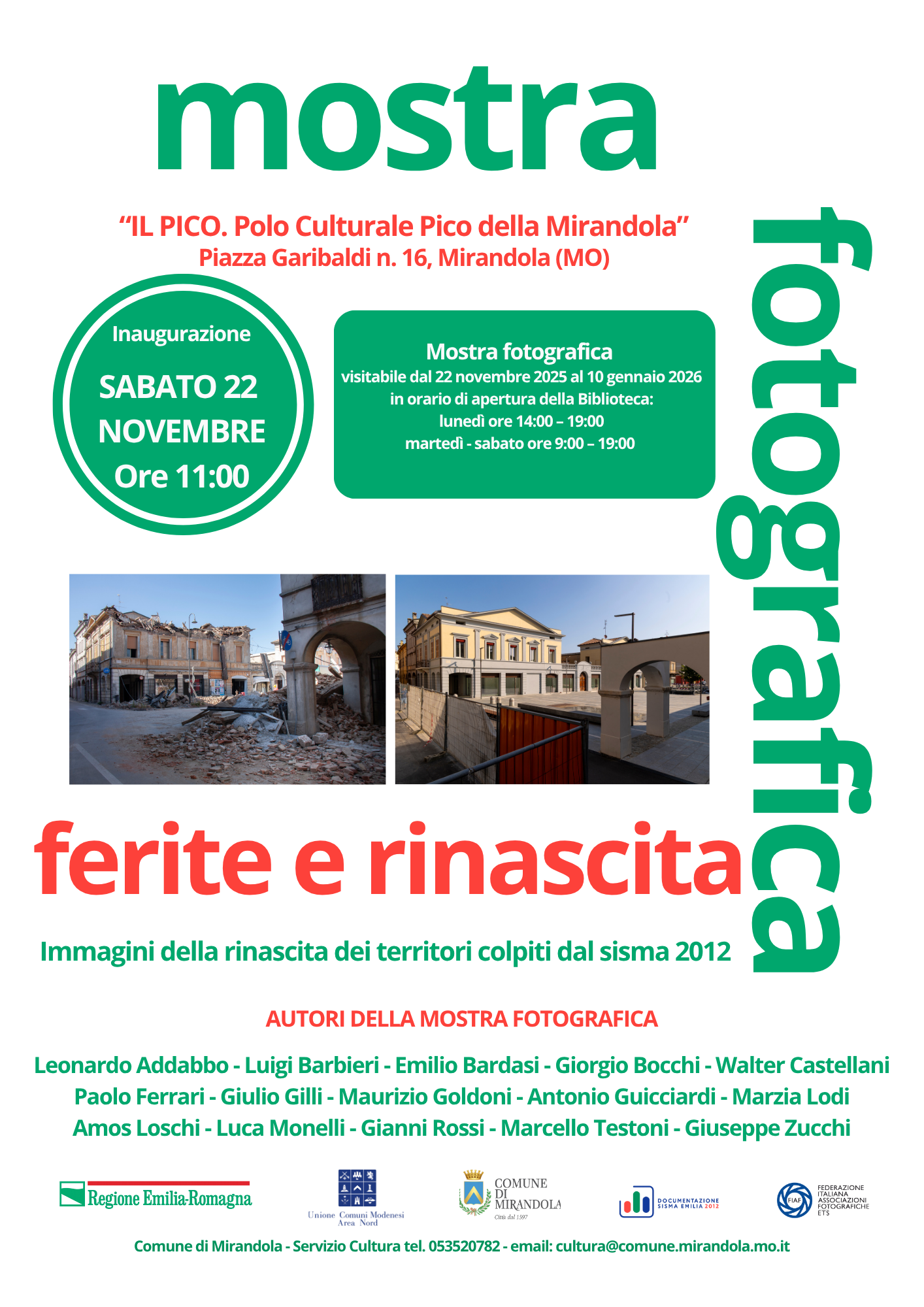 Sabato 22 novembre, alle ore 11.00, al Polo Culturale "Il Pico" di piazza Garibaldi 16 a Mirandola, verrà inaugurata la mostra "Ferite e Rinascita", immagini della rinascita dei territorio colpiti dal sisma 2012. Verranno esposte fotografie realizzate da: Leonardo Addabbo, Luigi Barbieri, Emilio Bardasi, Giorgio Bocchi, Walter Castellani, Paolo Ferrari, Giulio Gilli, Maurizio Goldoni, Antonio Guicciardi, Marzia Lodi, Amos Loschi, Luca Monelli, Gianni Rossi, Marcello Testoni e Giuseppe Zucchi.