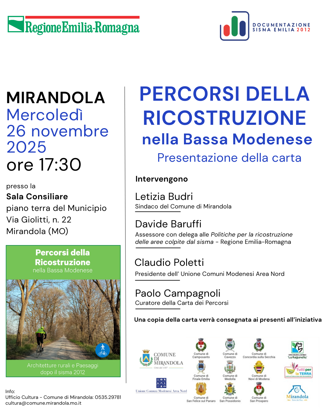 Mercoledì 26 novembre, alle ore 17.30, presso la sala consiliare del Municipio di Mirandola, in via Giolitti 22, il curatore Paolo Campagnoli presenterà la carta "Percorsi della Ricostruzione nella Bassa Modenese", dedicata ai percorsi pedonali e ciclabili del territorio colpito dal sima del 2012.