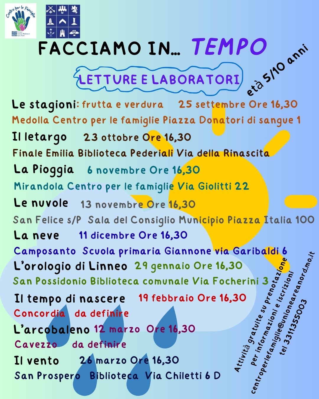 I laboratori e le attività si svolgeranno a Medolla (25 settembre), Finale Emilia (alla Biblioteca Pederiali, 23 ottobre ore 16.30), Mirandola (6 novembre), San Felice sul Panaro (13 novembre), Camposanto (11 dicembre), San Possidonio (29 gennaio), Concordia (19 febbraio), Cavezzo (12 marzo) e San Prospero (24 marzo).