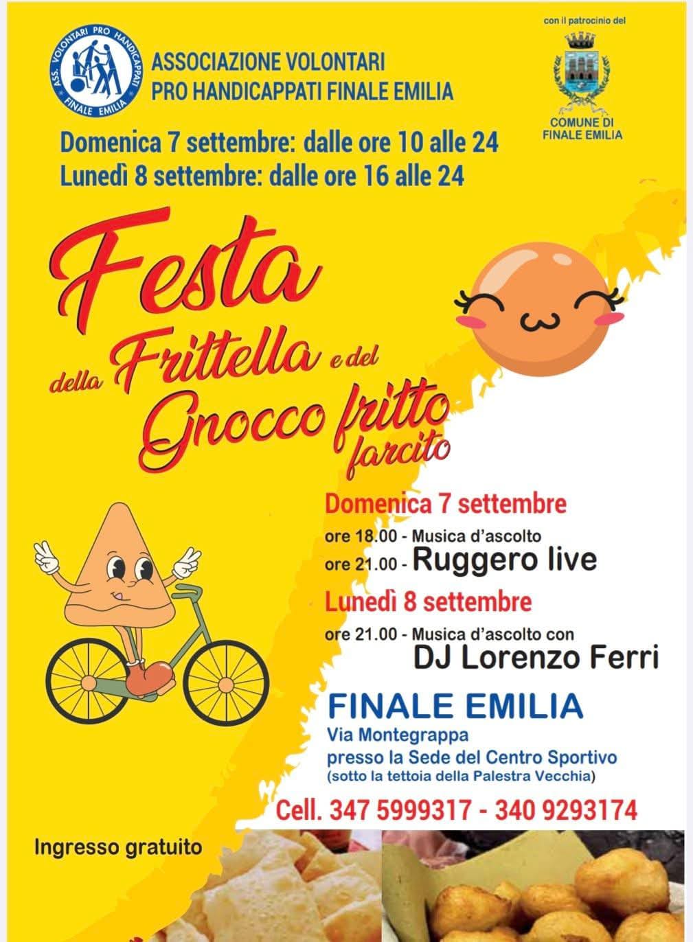 Domenica 7 dalle 10 alle 24 e lunedì 8 settembre dalle 16 alle 24, Festa della Frittella e del Gnocco Fritto con l'associazione Volontari Pro Handicappati di Finale Emilia, presso la sede di via Monte Grappa (sotto la tettoia della palestra ex Bocciofila).
