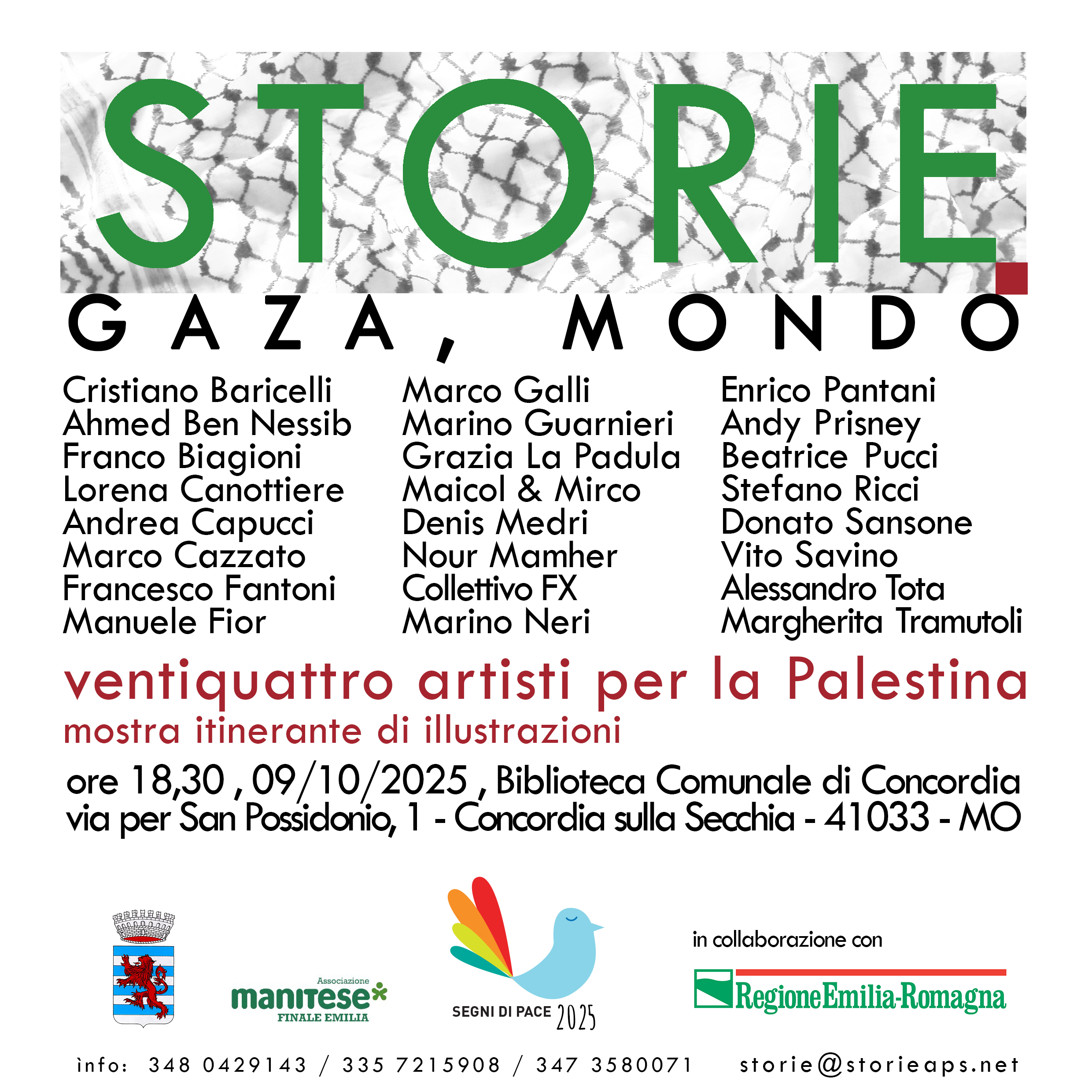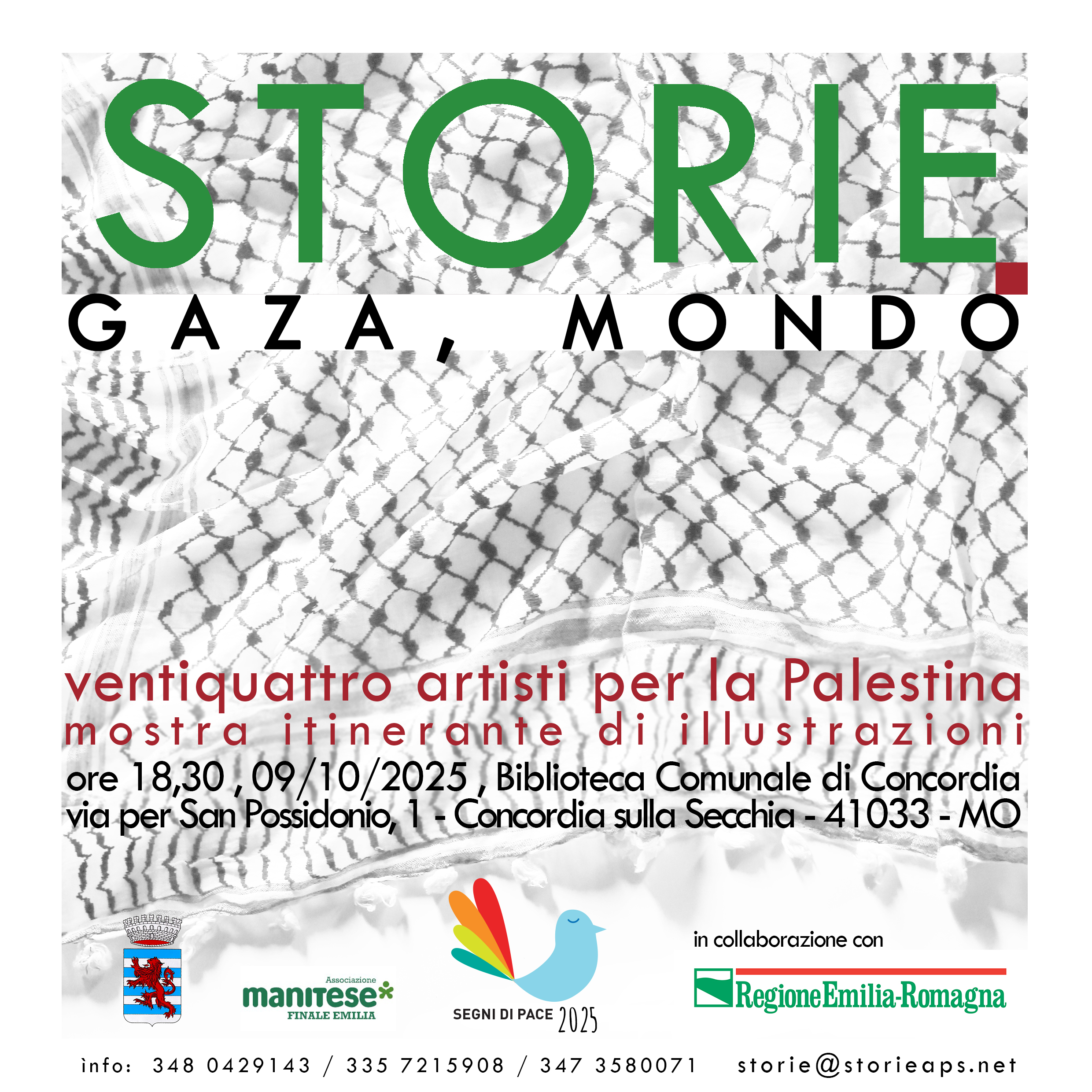 Storie Aps, in collaborazione con Mani Tese Finale Emilia e nell’ambito di"Segni di Pace" - progetto cofinanziato dalla Regione Emilia-Romagna che mira a promuovere la cultura della pace e della giustizia sociale - organizza la mostra itinerante “Gaza, Mondo”, una iniziativa indirizzata al tentativo di sviluppare sensibilità sul tema del genocidio contro la popolazione palestinese.