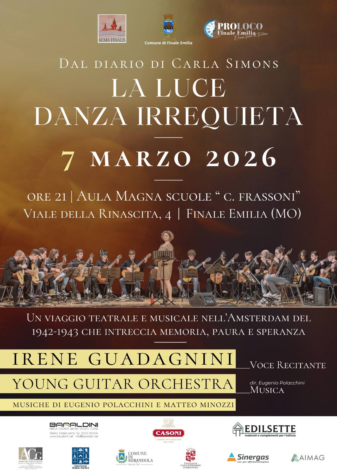 La voce dell’attrice Irene Guadagnini, la musica dei Bruskers Guitar Duo (Eugenio Polacchini e Matteo Minozzi) e della Young Guitar Orchestra della Fondazione Scuola Di Musica Carlo E Guglielmo Andreoli accompagneranno il racconto della sua storia.