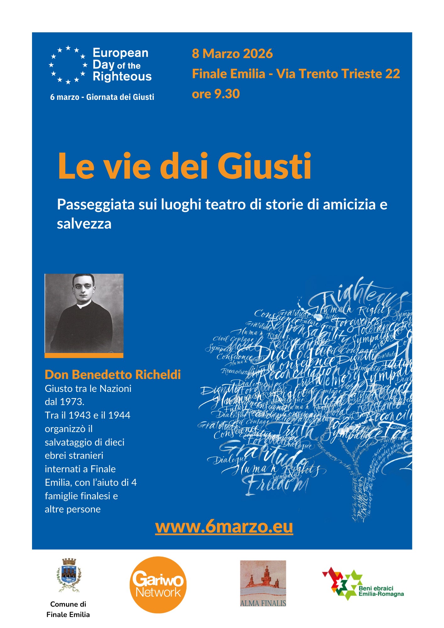Domenica 8 marzo, dalle ore 9.30, per il terzo anno Alma Finalis propone la passeggiata storica “Le vie dei Giusti” per le strade di Finale Emilia, con soste davanti alle abitazioni delle famiglie finalesi che aiutarono il Giusto tra le Nazioni Don Benedetto Richeldi nel salvataggio di 10 ebrei stranieri al confino nella nostra città.
