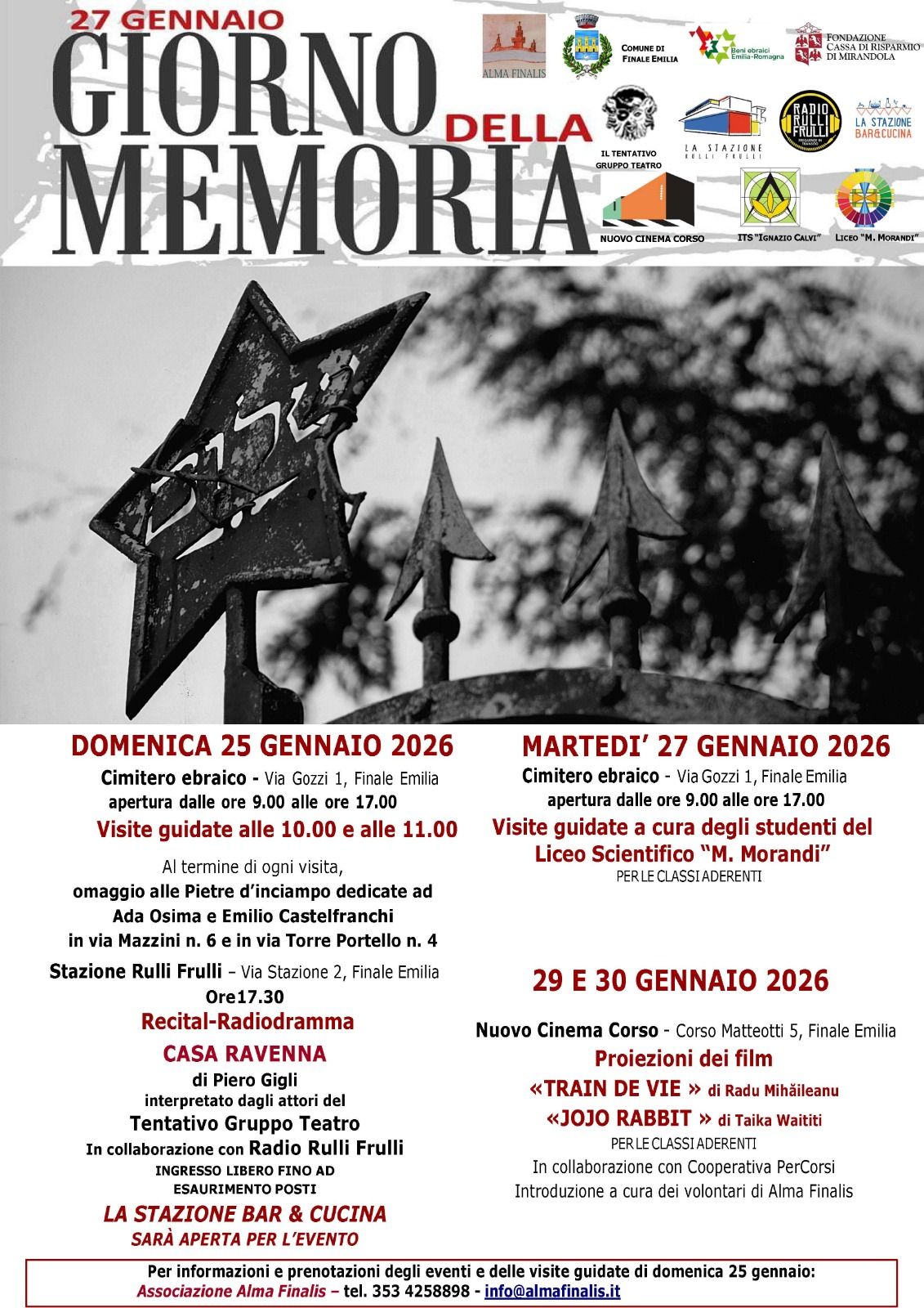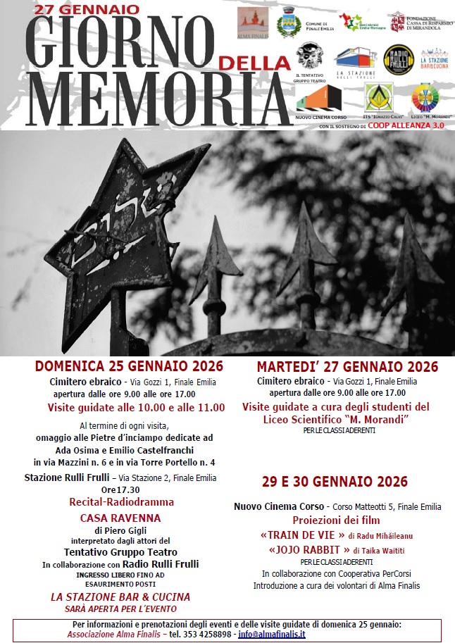 In occasione del Giorno della Memoria, Alma Finalis, in collaborazione con il Comune di Finale Emilia, organizza per domenica 25 gennaio visite guidate al cimitero ebraico e alle pietre d’inciampo dedicate ad Ada Osima ed Emilio Castelfranchi. Turni di visita alle 10.00 e alle 11.00