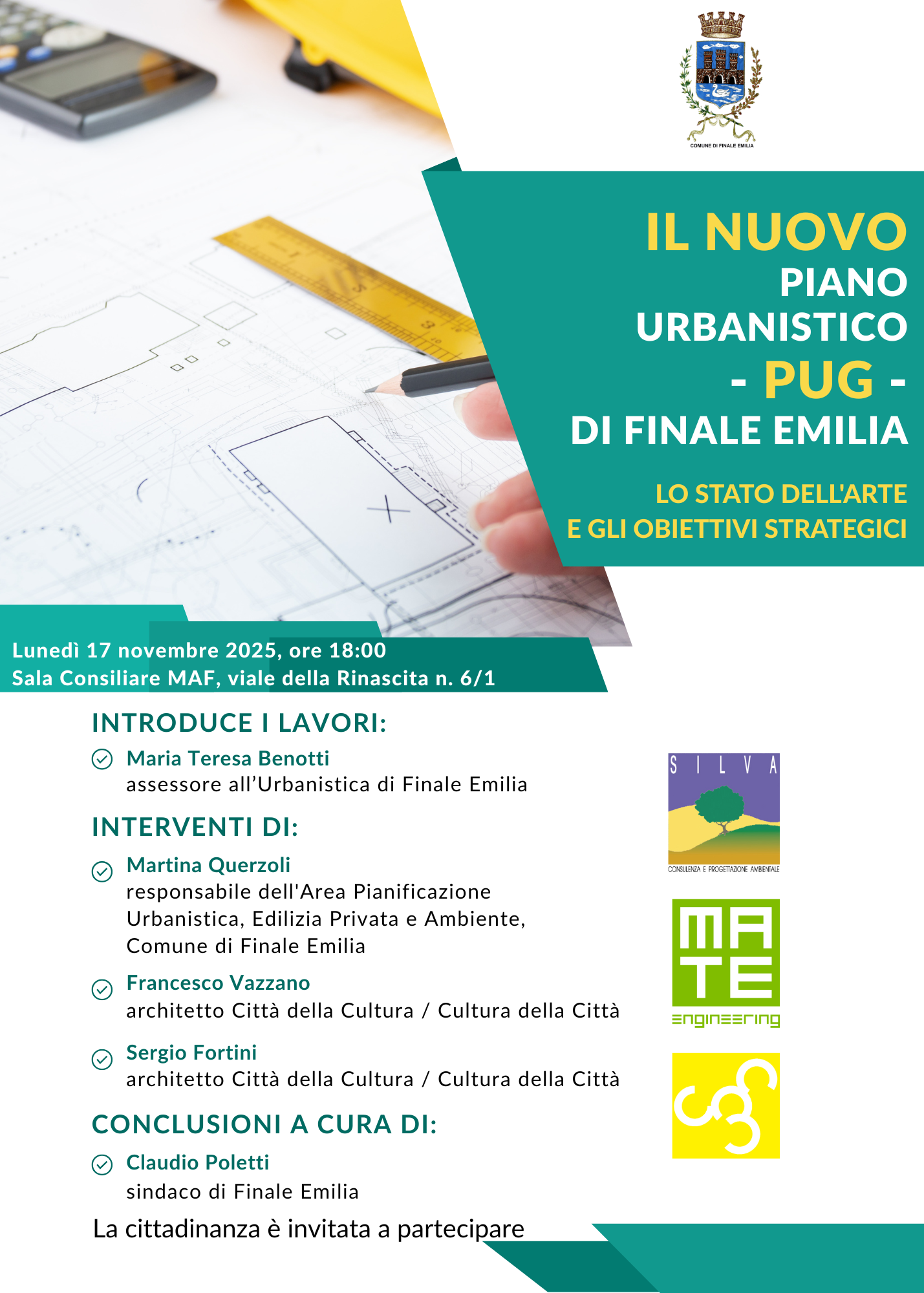 Introdurrà i lavori, l'assessore all'Urbanistica Maria Teresa Benotti, poi sono previsti gli interventi di Martina Querzoli, responsabile dell'Area Pianificazione Urbanistica, Edilizia Privata e Ambiente del Comune di Finale Emilia, Francesco Vazzano e Sergio Fortini, architetti di Città della Cultura/Cultura della Città Società Cooperativa. Concluderà i lavori, il sindaco di Finale Emilia, Claudio Poletti.