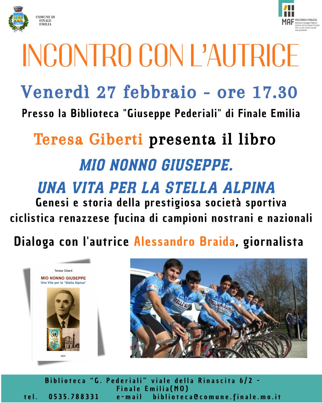 Venerdì 27 febbraio, alle ore 17.30, la biblioteca Giuseppe Pederiali per il ciclo "Incontro con l'autrice", ospiterà Teresa Giberti che presenterà il suo libro "Mio nonno Giuseppe. Una vita per la Stella Alpina".