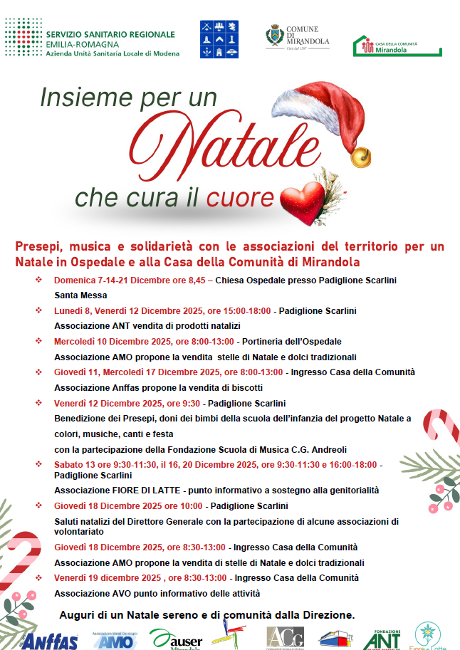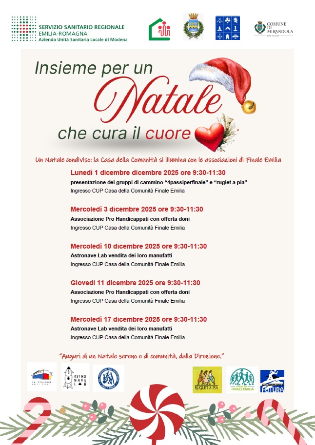 Il Distretto di Mirandola – AUSL di Modena in collegamento con gli Enti Locali rinnova anche quest’anno il proprio impegno nel valorizzare il ruolo della comunità e delle reti territoriali attraverso un articolato programma di iniziative natalizie realizzate in collaborazione con le associazioni del Terzo Settore. Le attività, ospitate presso l’Ospedale di Mirandola e le Case della Comunità di Finale Emilia e Mirandola, intendono promuovere vicinanza, solidarietà e partecipazione, offrendo ai cittadini occasioni di incontro e condivisione durante il periodo delle festività.