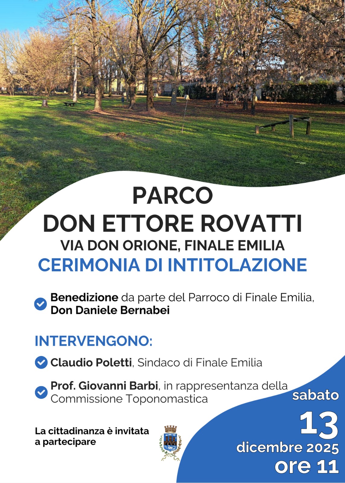 Sabato 13 dicembre 2025, alle ore 11.00, verrà intitolato a Don Ettore Rovatti, parroco di Finale Emilia per 44 anni, dall’ottobre 1971 al giorno della sua morte, giunta improvvisa l’11 maggio 2015, il parco situato a fianco dell’ex Seminario.