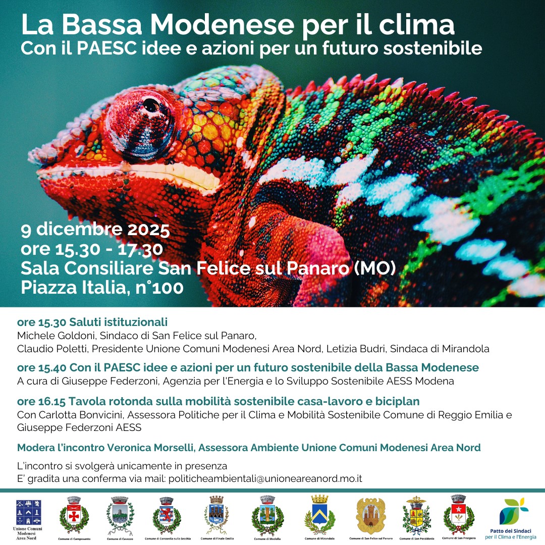 Martedì 9 dicembre 2025, dalle ore 15.30 alle 17.30, la Sala Consiliare del Comune di San Felice sul Panaro, in piazza Italia 100, ospiterà l’incontro “La Bassa Modenese per il clima. Con il PAESC idee e azioni per un futuro sostenibile”.