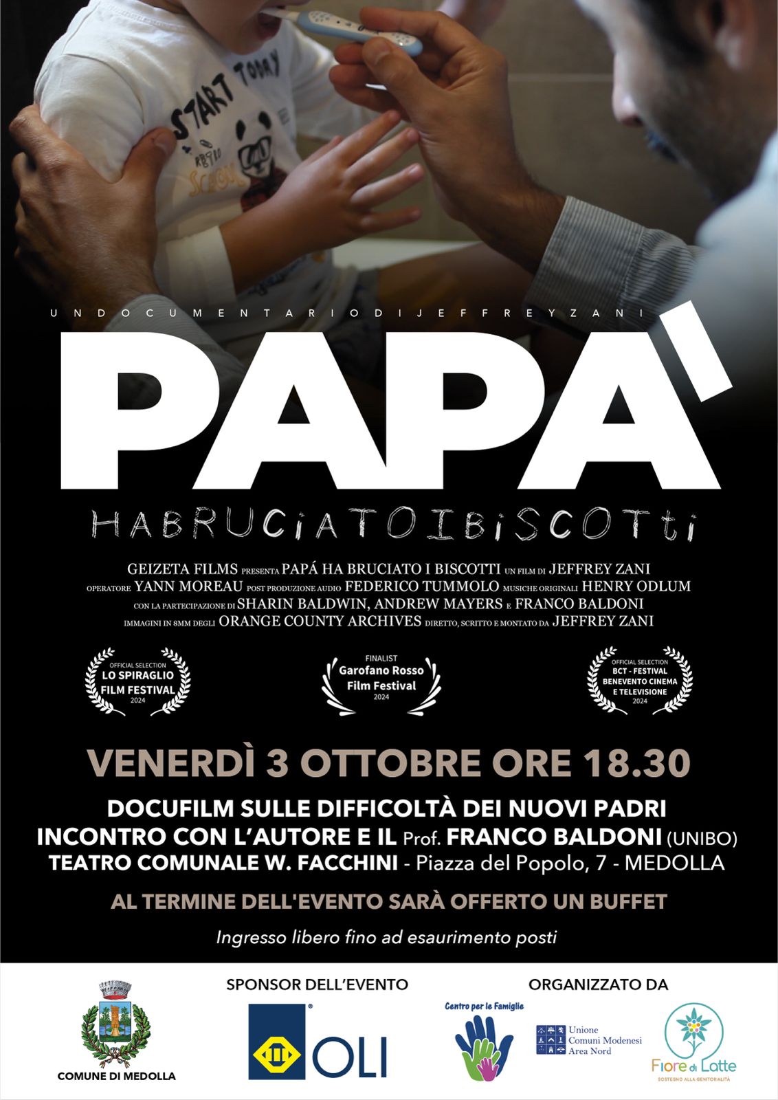 Le difficoltà dei nuovi padri, è il tema che viene affrontato nel docu-film “Papà ha bruciato i biscotti”, che verrà proiettato, grazie al Centro per le Famiglie, all’Unione Comuni Modenesi Area Nord e all’associazione Fiore di Latte, venerdì 3 ottobre, alle ore 18.30, al Teatro Comunale W. Facchini di Medolla.