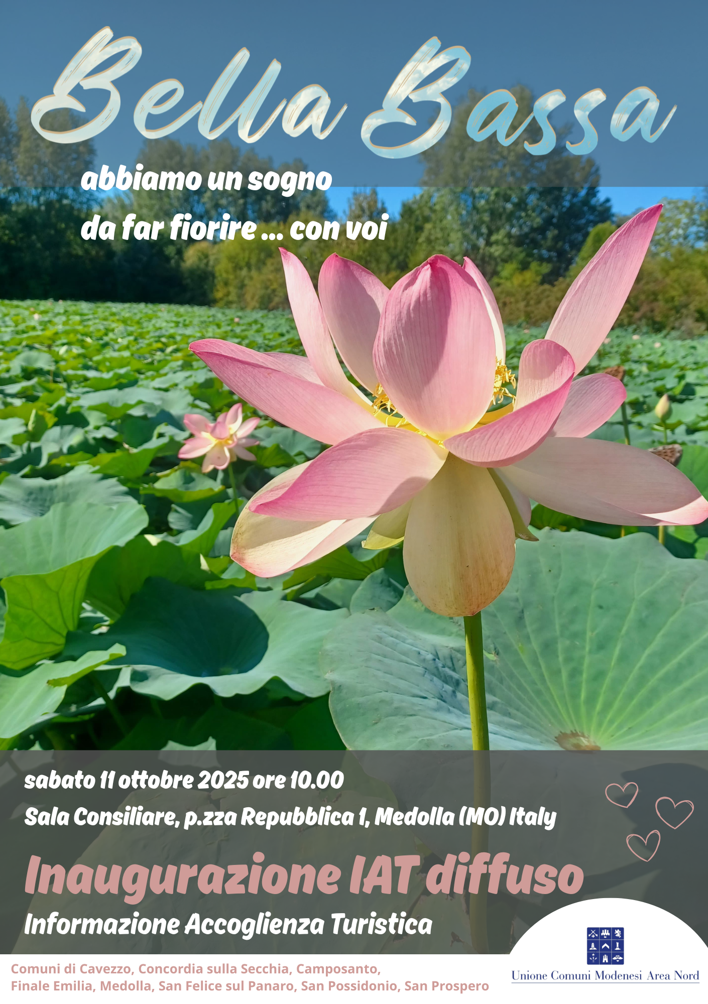 Sabato 11 ottobre 2025, alle ore 10.00, presso l'Auditorium Comunale di via Genova 10, a Medolla, avrà luogo l'inaugurazione dello IAT DIFFUSO dell'Unione Comuni Modenesi Area Nord che si terrà con una conferenza stampa.