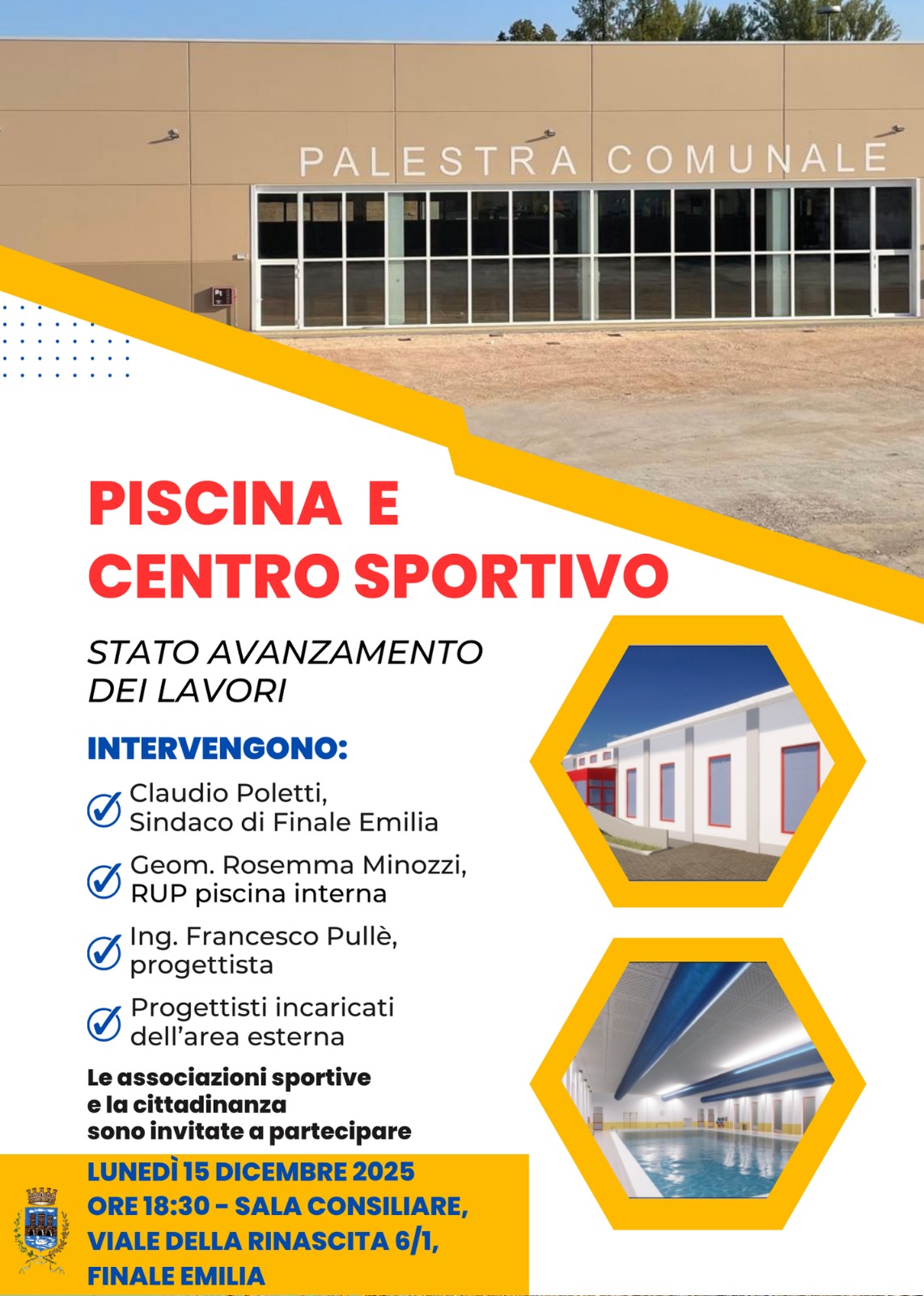 Lunedì 15 dicembre 2025, alle ore 18.30, presso la Sala Consiliare MAF di viale della Rinascita, aggiornamento sullo stato di avanzamento lavori della Piscina Comunale coperta.