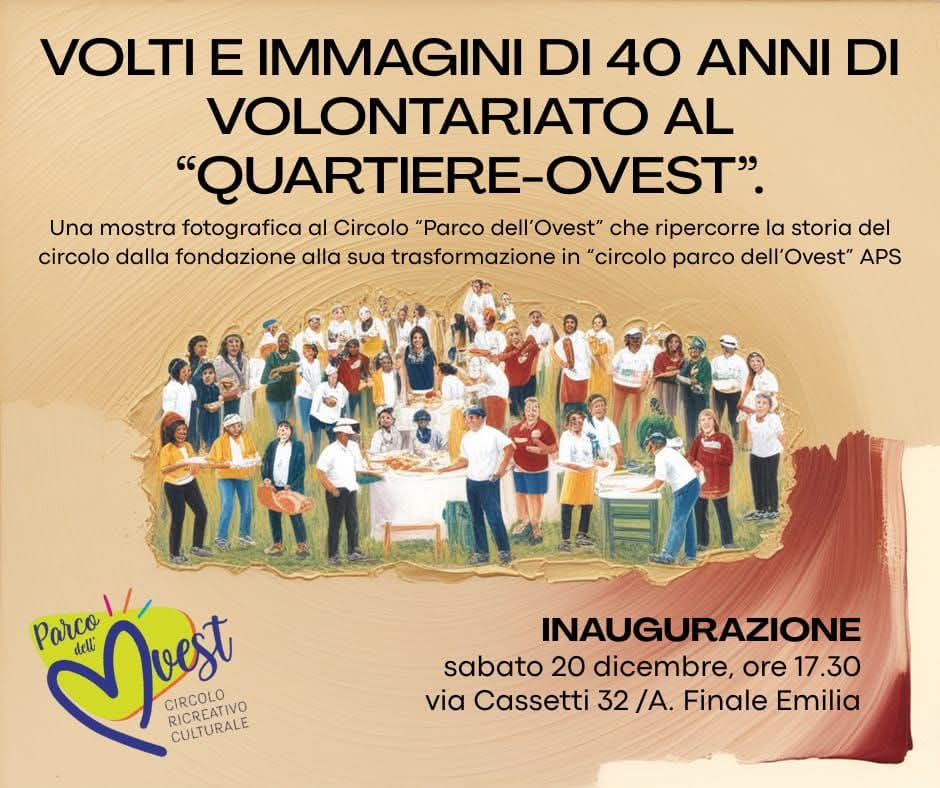 "Volti e immagini di 40 anni di volontariato al Quartiere Ovest" è il titolo della mostra fotografica che verrà inaugurata sabato 20 dicembre, alle ore 17.30 nella sede del Circolo Parco dell’Ovest che l'ha organizzata.