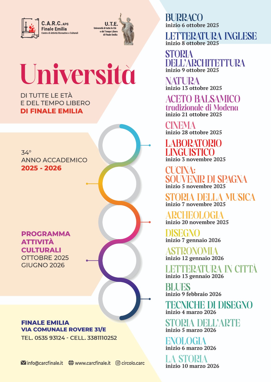 Sabato 20 settembre, il Carc, presso la propria sede di via Comunale Rovere 31/E, presenterà i corsi del 34° anno accademico dell'UTE, l'Università di tutte le età e del tempo libero.
