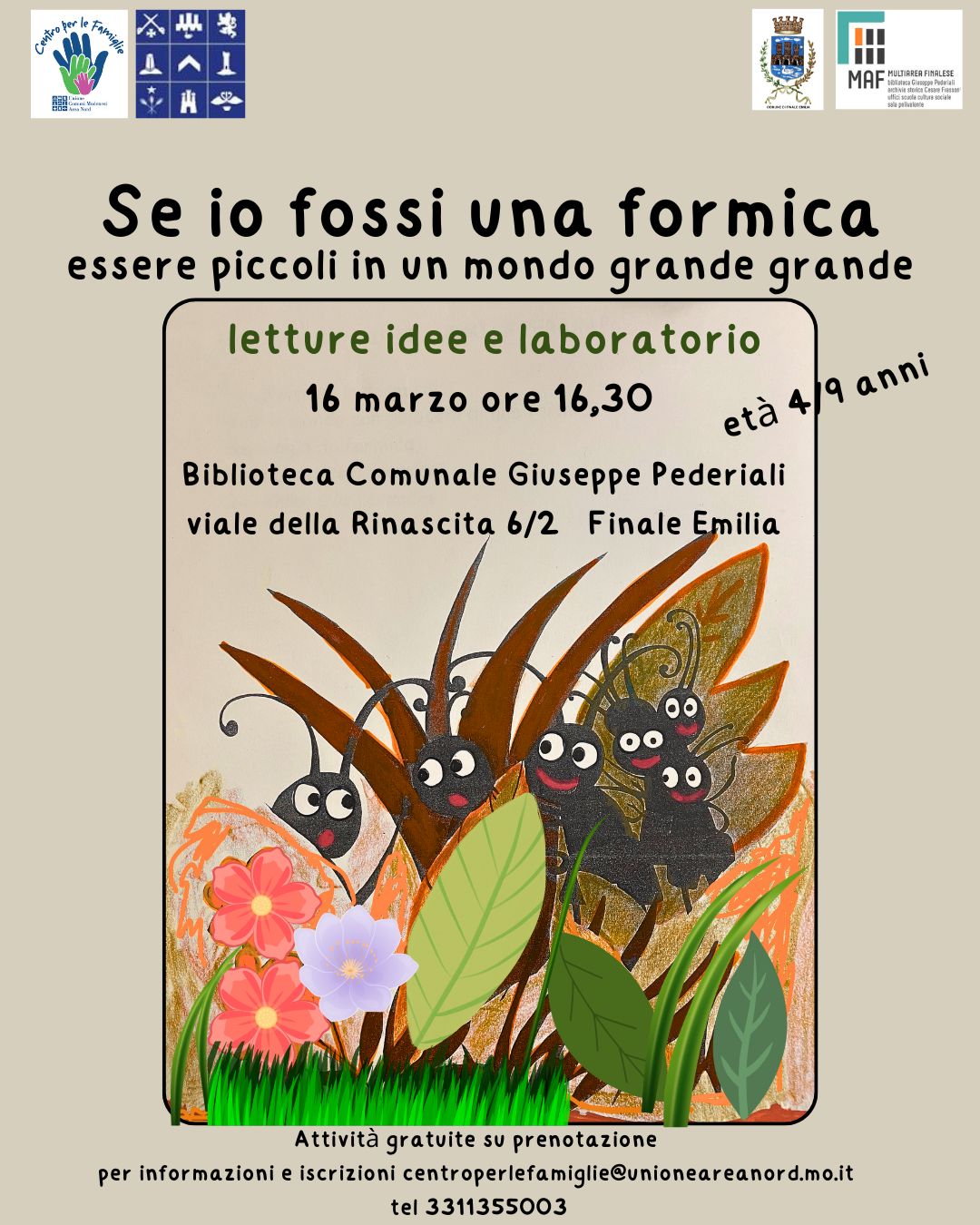 “Se io fossi una formica…Essere piccoli in un mondo grande grande “ appuntamento con il Centro per le Famiglie dell’Unione Comuni Modenesi Area Nord, lunedì 16 marzo alle ore 16.30 presso la Biblioteca Comunale Giuseppe Pederiali di Finale Emilia.