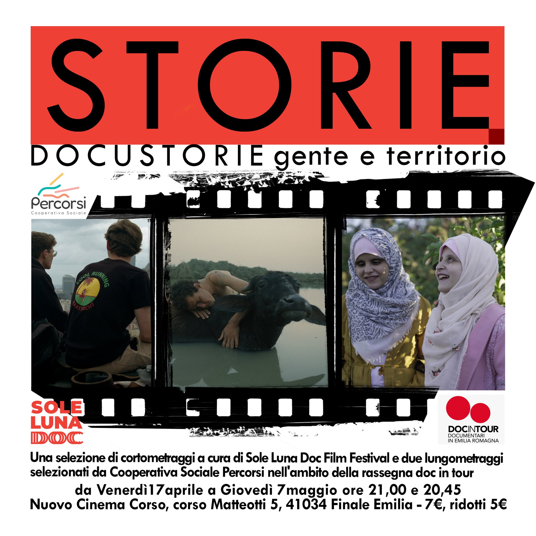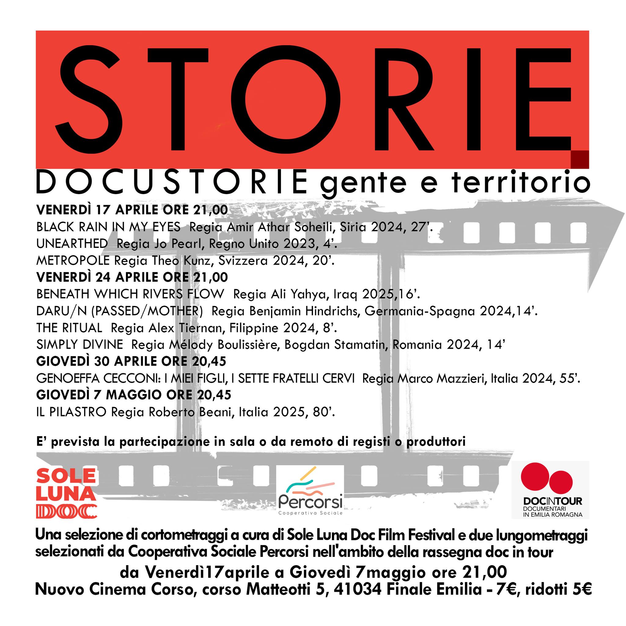 Una selezione di cortometraggi a cura di Sole Luna Doc Film Festival e due lungometraggi selezionati da Cooperativa Sociale Percorsi nell'ambito della rassegna Doc in Tour è il nuovo appuntamento promosso da Storie Aps.