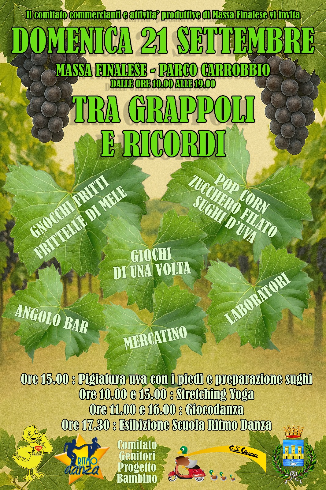 Domenica 21 settembre, a partire dalle ore 10 e per l’intera giornata, il Parco Carrobio di Massa Finalese sarà la cornice della prima edizione di “Tra grappoli e ricordi”, un evento che punta a valorizzare le tradizioni contadine e la socialità di un tempo, con un format del tutto nuovo.