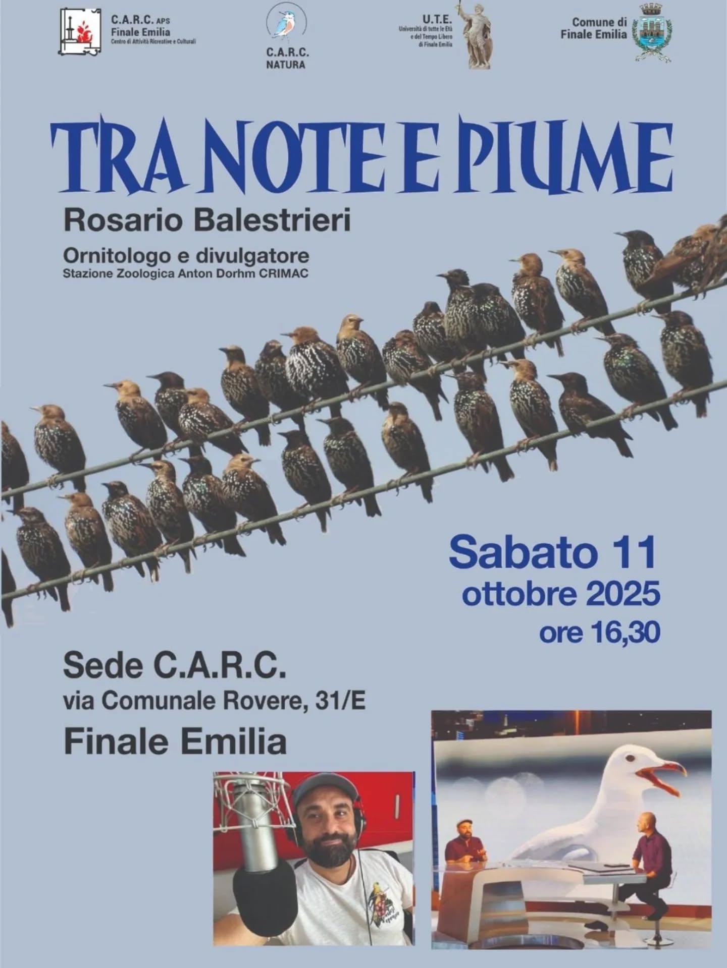 Sabato 11 ottobre, alla ore 16.30 la sede del CARC di via Comunale Rovere31/E, ospiterà la conferenza "Tra note e piume" a cura di Rosario Balestrieri, ornitologo della stazione zoologica Anton Dohrm CRIMAC, consigliere del Centro Italiano Studi Ornitologici e Presidente dell'Associazione Ardea onlus.