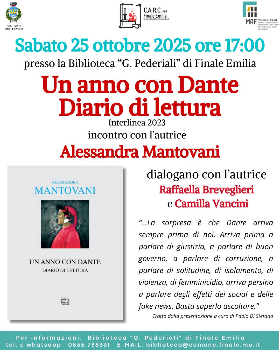Sabato 25 ottobre 2025, alle ore 17:00, la Biblioteca G. Pederiali di Finale Emilia ospita Alessandra Mantovani con il suo libro "Un anno con Dante. Diario di lettura".