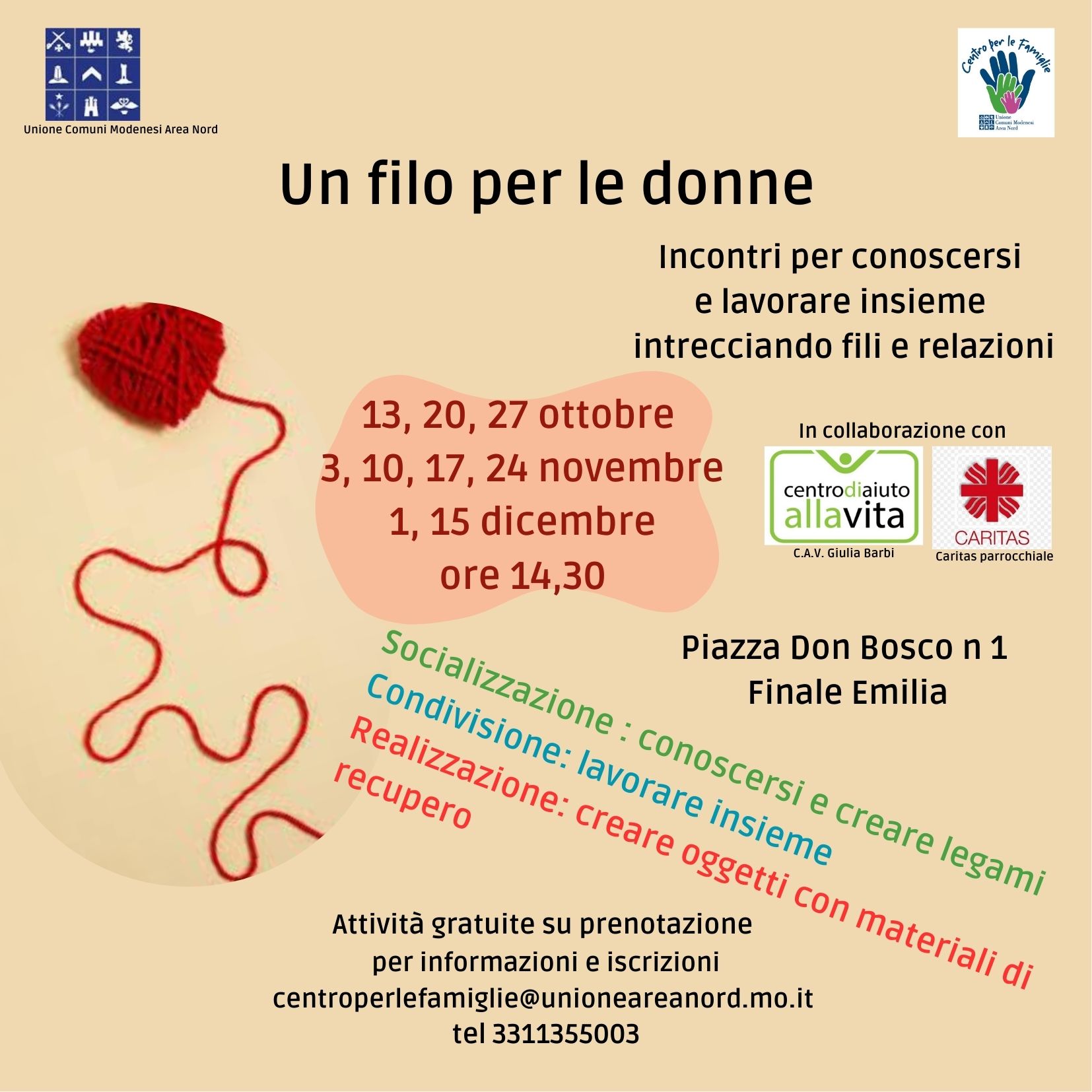 Una serie di incontri per conoscersi e lavorare insieme intrecciando fili e relazioni: sono gli appuntamenti di "Un filo per le donne", organizzati dal Centro per le Famiglie dell'Unione Comuni Modenesi Area Nord, in collaborazione con il Centro aiuto alla vita Giulia Barbi di Finale Emilia e la Caritas Parrocchiale, presso le sale dell'ex seminario, in piazza don Bosco 1, a Finale Emilia.