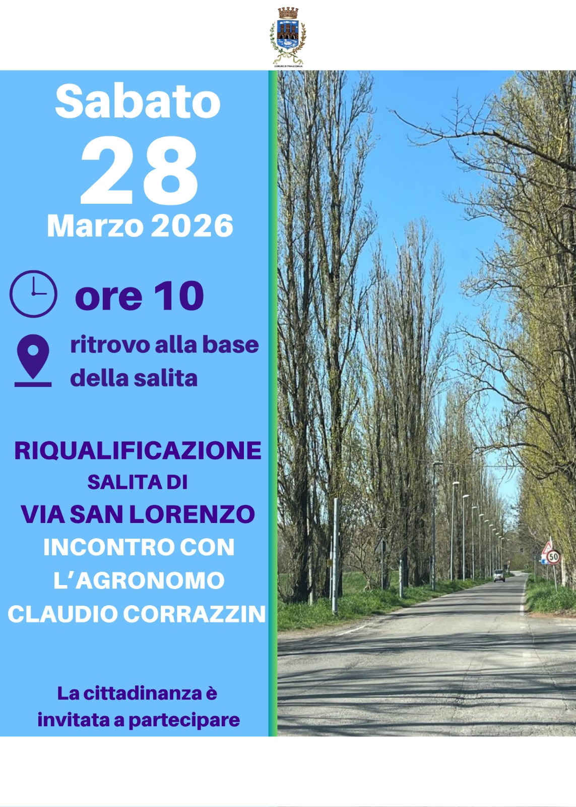 Sabato 28 marzo alle ore 10.00, l'agronomo Claudio Corrazzin illustrerà come verrà riqualificata la salita di via San Lorenzo (via Argine Sinistro Panaro). Verranno spiegate le modalità di intervento, la sostituzione delle piante deteriorate e la piantumazione di nuove alberature.