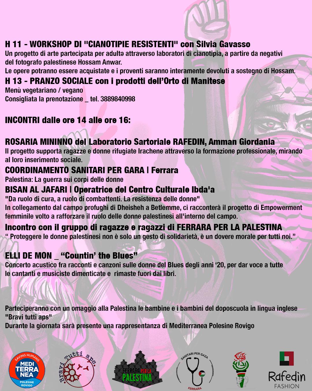 Il programma prevede alle ore 11.00 il workshop di “Cianotipie resistenti” con Silvia Gavasso, un progetto di arte partecipata per adulti, attraverso laboratori di cianotipia, a partire dai negativi del fotografo palestinese Hossam Anwar. Seguirà alle ore 13.00 il pranzo sociale con i prodotti dell’orto di Manitese (menù vegetariano/vegano; consigliata la prenotazione al 3889840998.
