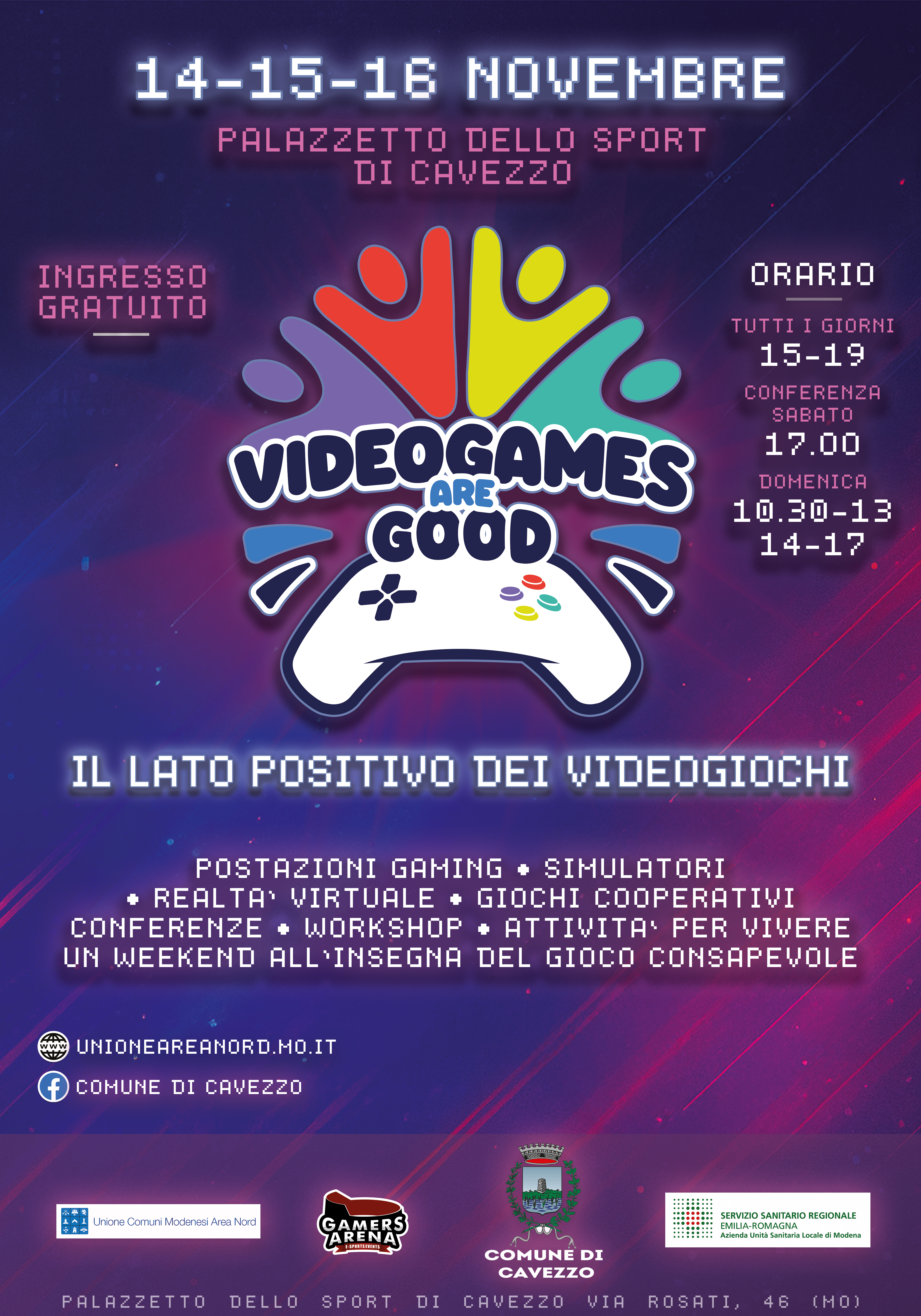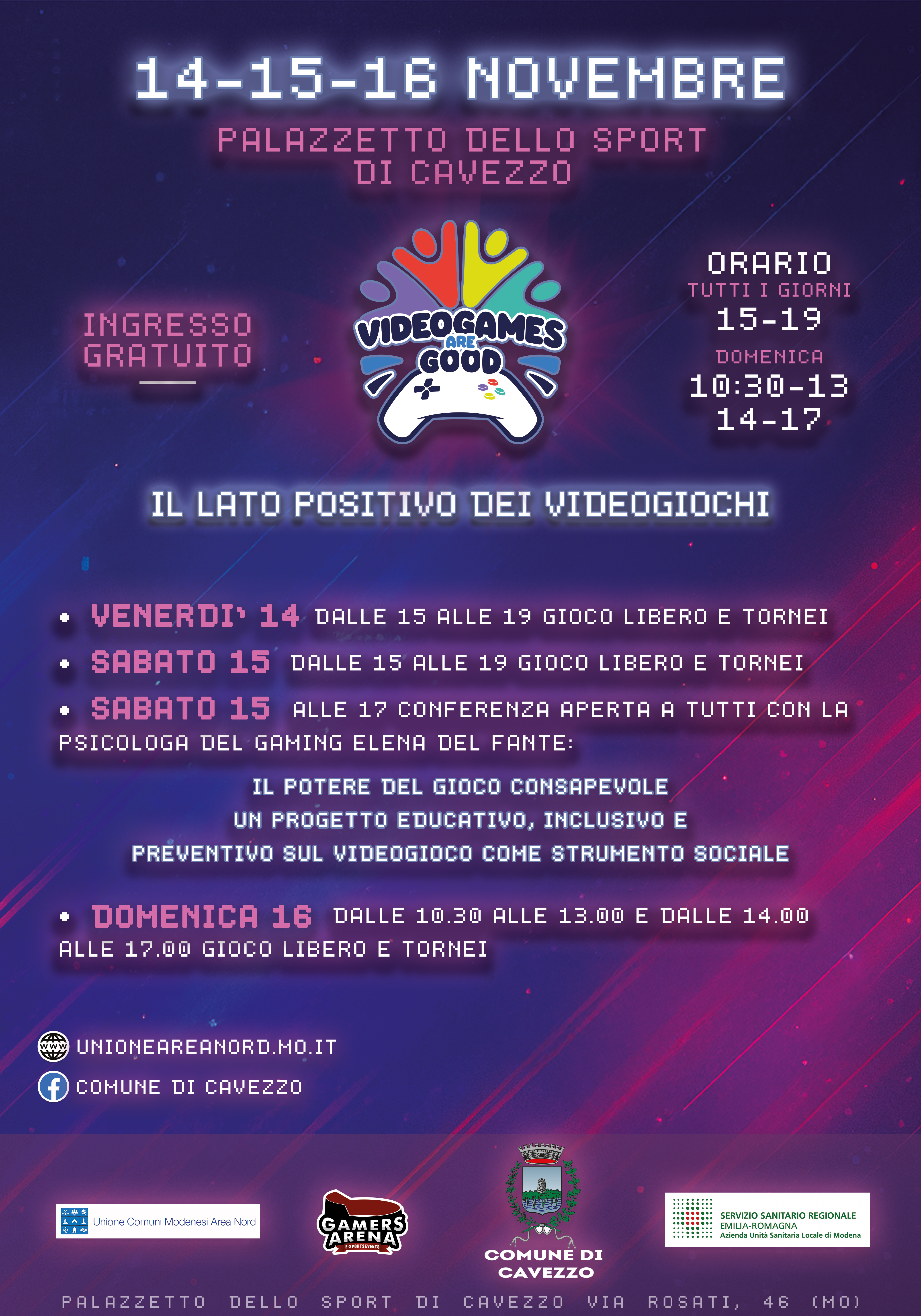 Dal 14 al 16 novembre 2025 il Palazzetto dello Sport di Cavezzo ospita “Videogames Are Good – Il lato positivo dei videogiochi”, un’iniziativa gratuita promossa dal Comune di Cavezzo e dall’Unione Comuni Modenesi Area Nord in collaborazione con Gamers Arena ASD e AUSL di Mirandola.