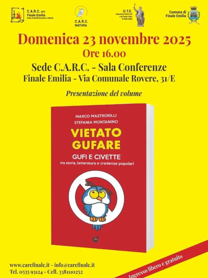 Domenica 23 novembre, alle ore 16.00, la sala conferenze del CARC di via Comunale Rovere 31/e, ospita la presentazione del libro di Marco Mastrorilli e Stefania Montanino "Gufi e civette tra storia, letteratura e credenze popolari".