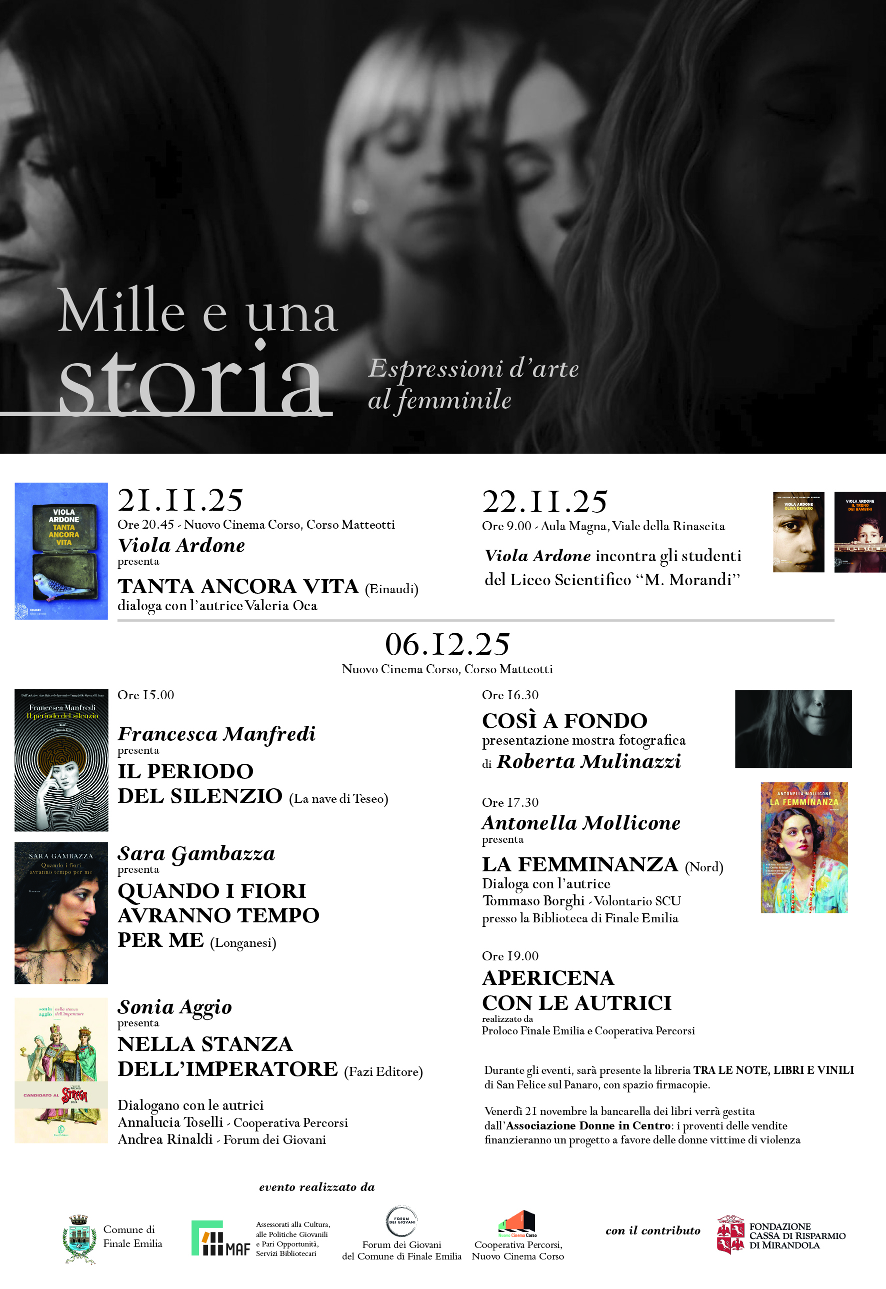 In occasione della Giornata internazionale per l'eliminazione della violenza contro le donne, gli assessorati alla Cultura, Politiche Giovanili, Pari Opportunità e Servizi Bibliotecari del Comune di Finale Emilia, in collaborazione con Forum dei Giovani e Cooperativa Percorsi, organizzano la rassegna letteraria “Mille e una storia”.